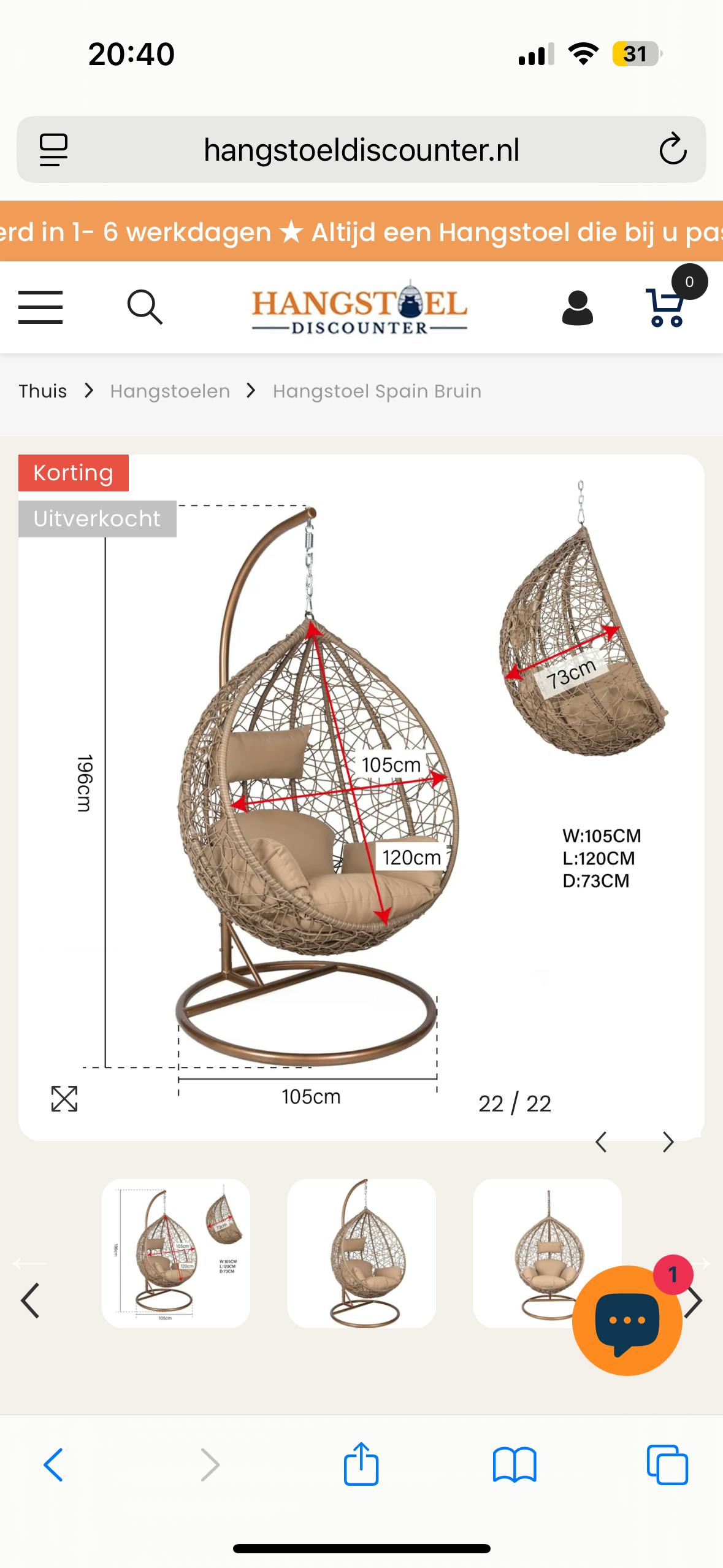 Kleur valt wat donkerder uit dan op de website, maar nog steeds mooi. Goed stevig groot ei met een heerlijk groot kussen. Ik was eerst wat huiverig om via hangstoeldiscounter te bestellen. Zijn telefonisch niet bereikbaar. Stoel volgens website uitverkocht zijn maar nadat ik een attendering voor wanneer stoel weer op voorraad was had ingesteld kreeg ik mail dat ze er toch nog een paar op voorraad hadden. Vervolgens via chat en mail vervolgafspraken gemaakt voor de levering. Alles keurig volgens afspraak.